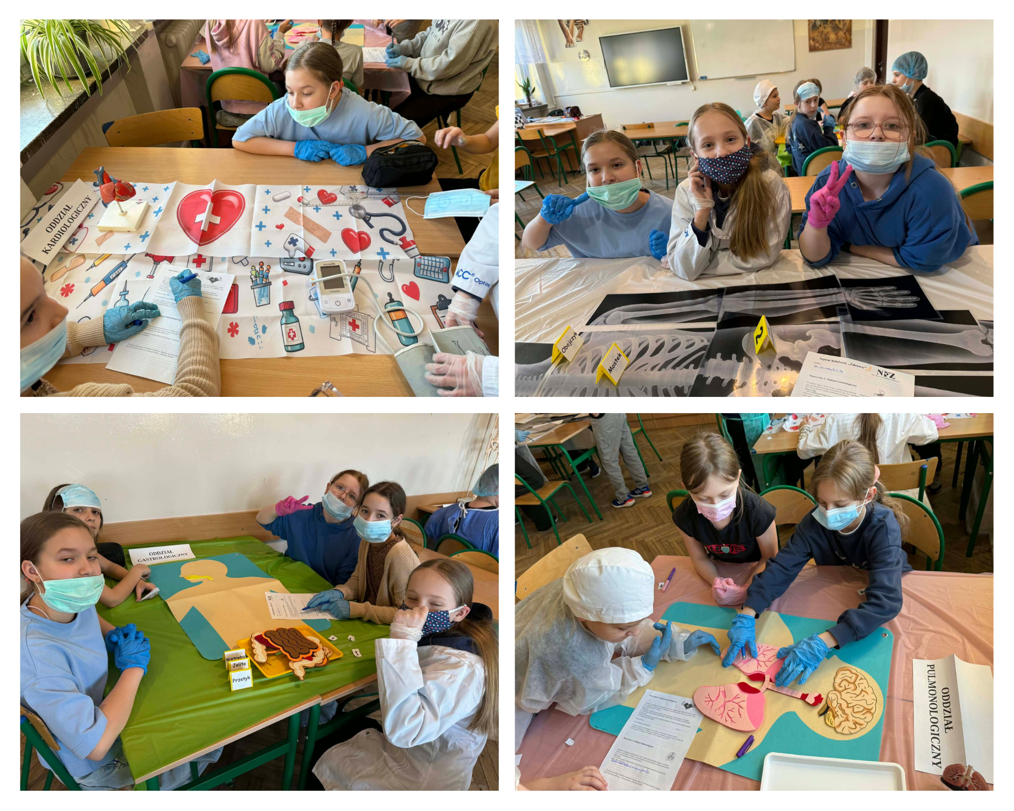 Skądże! Uczniowie klas czwartych udowodnili, że podsumowanie działu o ciele człowieka może być fascynującą misją ratunkową. Dziś nasza sala lekcyjna zmieniła się w wielooddziałowy szpital. Uczniowie, podzieleni na zespoły specjalistów, zmierzyli się z serią medycznych wyzwań. Dzięki fartuchom, czepkom i rękawiczkom atmosfera była niezwykle autentyczna. Lekcja udowodniła, że nauka o budowie ciała człowieka może być fascynującą przygodą. Gratulujemy wszystkim zespołom wiedzy, opanowania i świetnej współpracy!