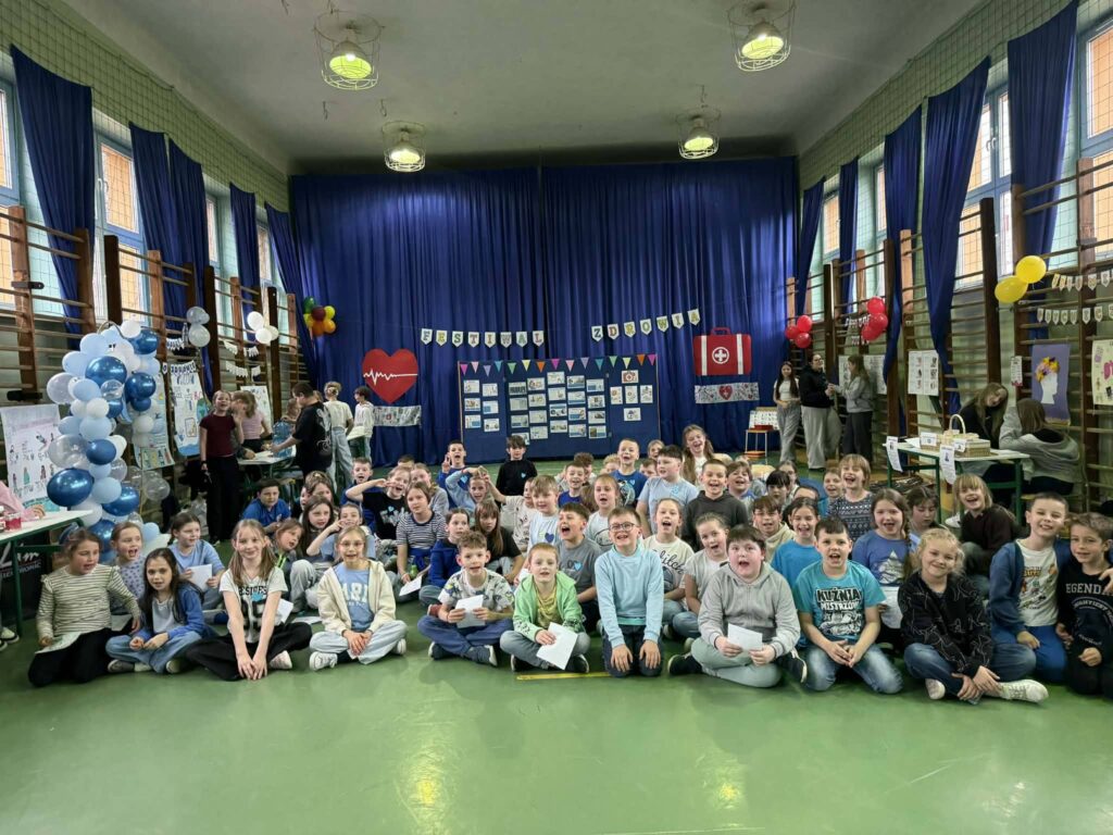 Duża sala gimnastyczna zamieniła się tego dnia w przestrzeń pełną ciekawych, interaktywnych stacji tematycznych. Uczniowie mieli okazję dowiedzieć się, jak ważne jest picie wody, zdrowe odżywianie, dbanie o zęby, ograniczanie cukru, aktywność fizyczna oraz troska o zdrowie psychiczne. Dużym zainteresowaniem cieszyła się również stacja pierwszej pomocy, gdzie można było zdobyć praktyczne i bardzo cenne umiejętności.