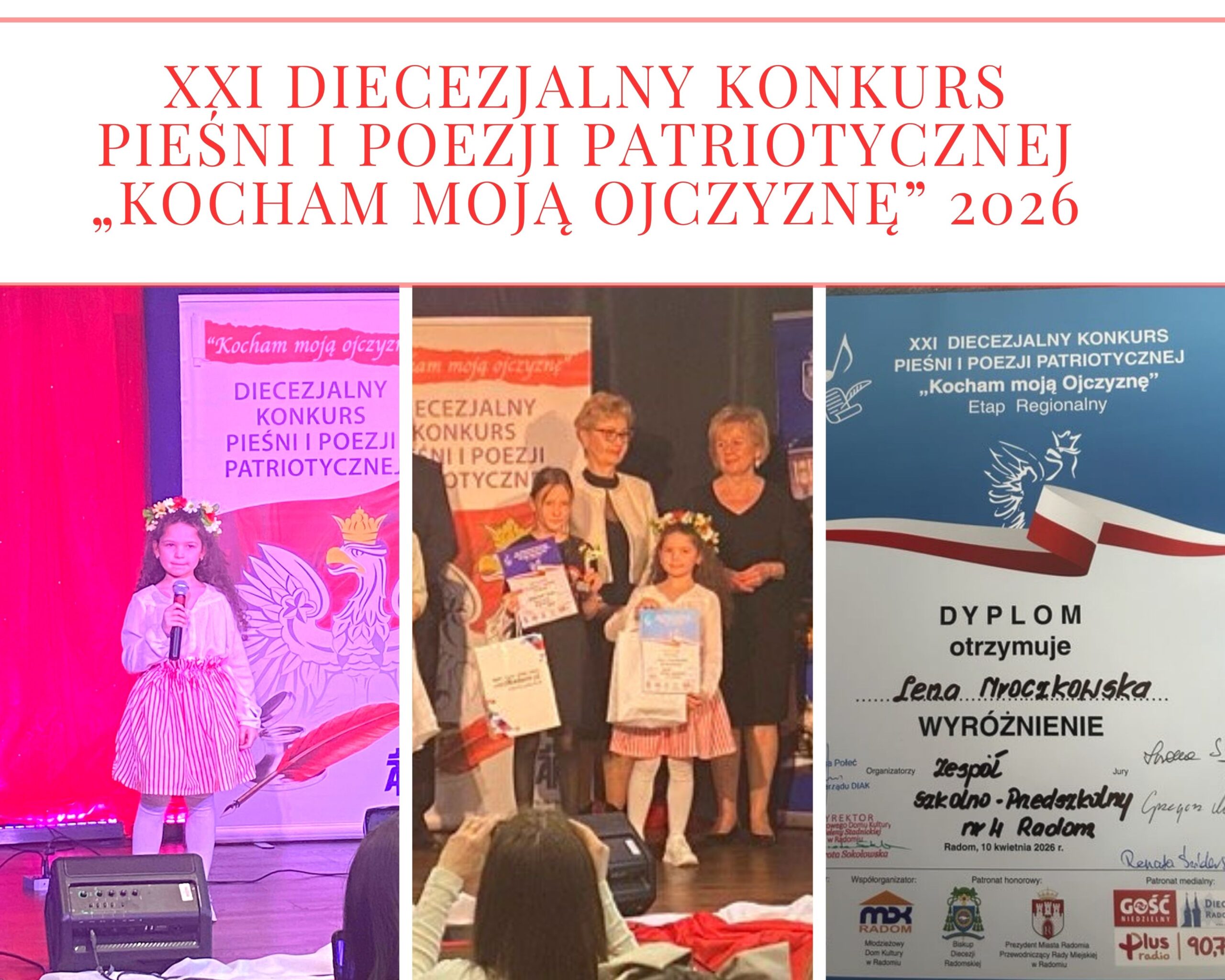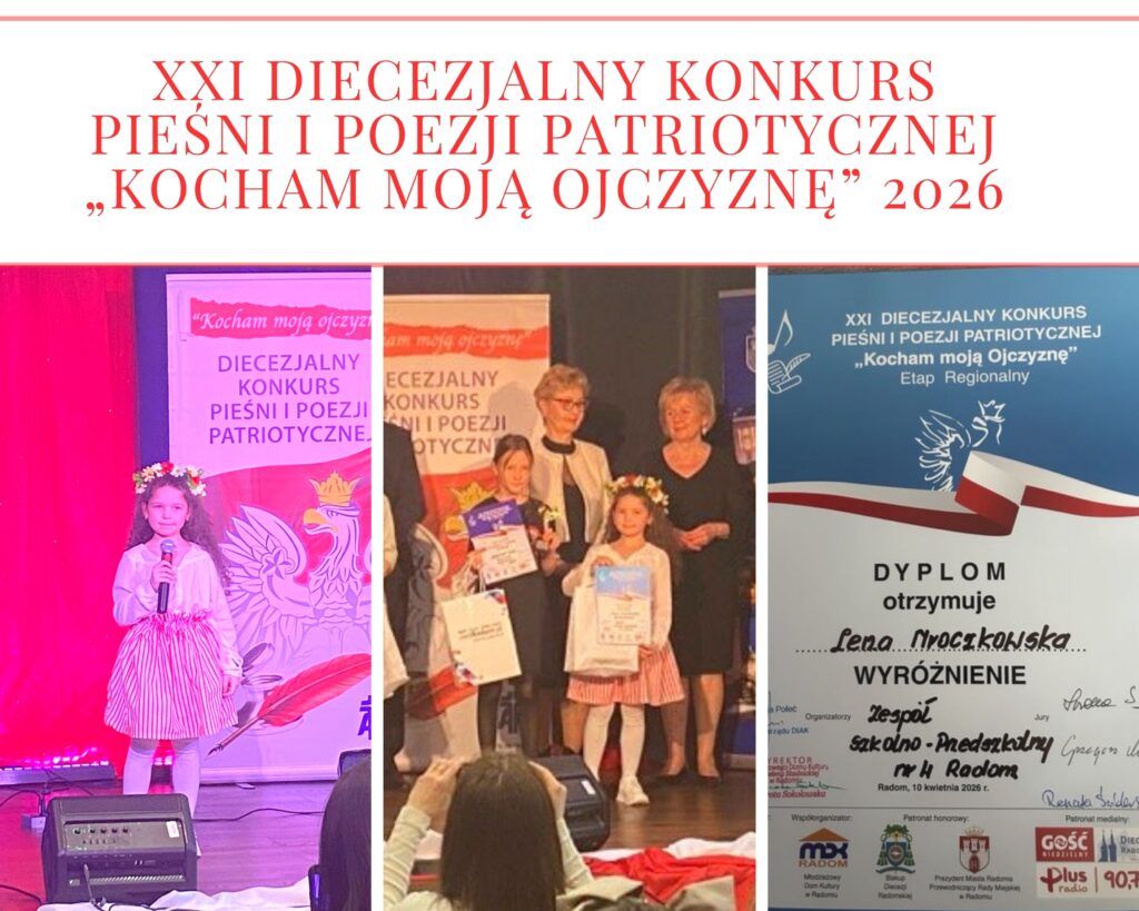 Z dumą informujemy, że nasze uczennice Lena z klasy 2c oraz Małgorzata z klasy 5a wzięły udział w XXI Rejonowym Konkursie Pieśni i Poezji Patriotycznej „Kocham Moją Ojczyznę”, organizowanym przez Diecezjalny Instytut Akcji Katolickiej Diecezji Radomskiej oraz Parafialne Oddziały Akcji Katolickiej.